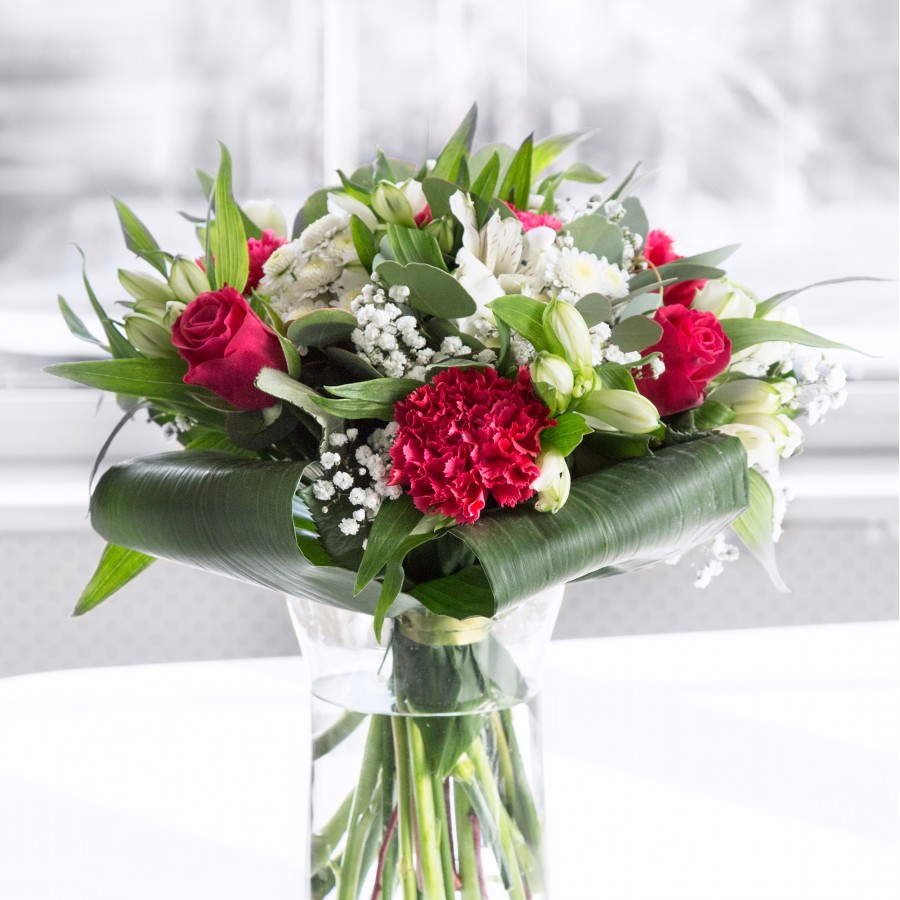 Indulge in the elegance of our premium bouquet that epitomizes luxury and style. This exquisitely arranged floral creation combines the purity of white chrysanthemums and the charm of gypsophila with the bold passion of red roses and carnations. The delicate notes of white alstroemeria and the graceful charm of aspidistra leaves complete this artistic ensemble.